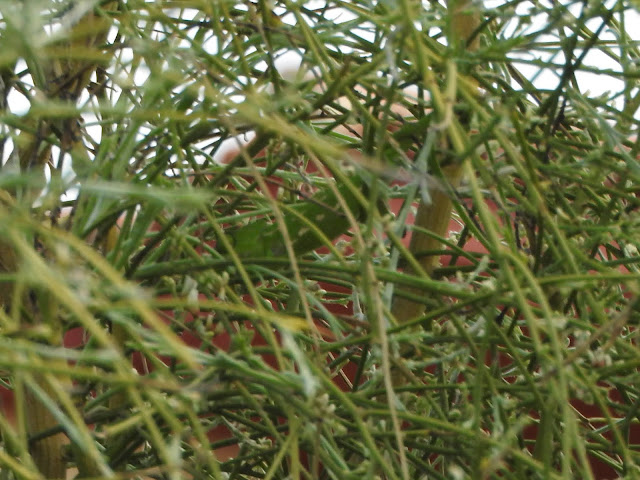 - un ejemplar joven de camaleón común (Chamaeleo chamaeleon). Según leí en un cartel informativo, los ejemplares adultos hibernan durante el invierno, pero no los ejemplares jóvenes, como así me demostró el que observé, durante dos mañanas, tomando el sol sobre una retama blanca (Retama monosperma).